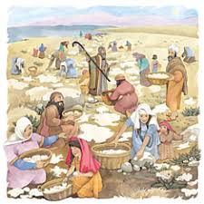 7And the manna was like coriander seed, and the appearance thereof as the appearance of bdellium. 8The people went about, and gathered it, and ground it in mills, or beat it in mortars, and seethed it in pots, and made cakes of it: and the taste of it was as the taste of fresh oil. 9And when the dew fell upon the camp in the night, the manna fell upon it.
