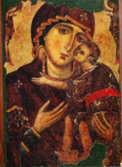 In a corner behind the iconostasis is another ancient icon, which was almost completely destroyed in WWII, not hidden away like Our Lady of Damascus. It was painstakingly remade, thankfully having the original faces of Mary and Jesus, which had not been touched by the bombing.